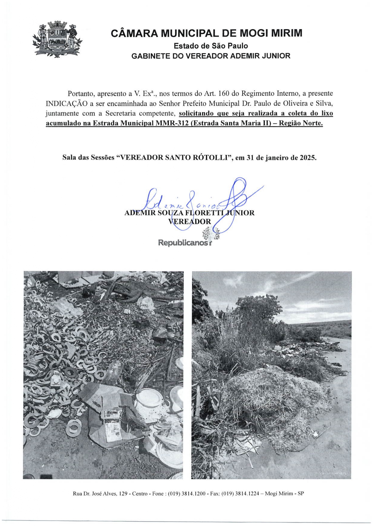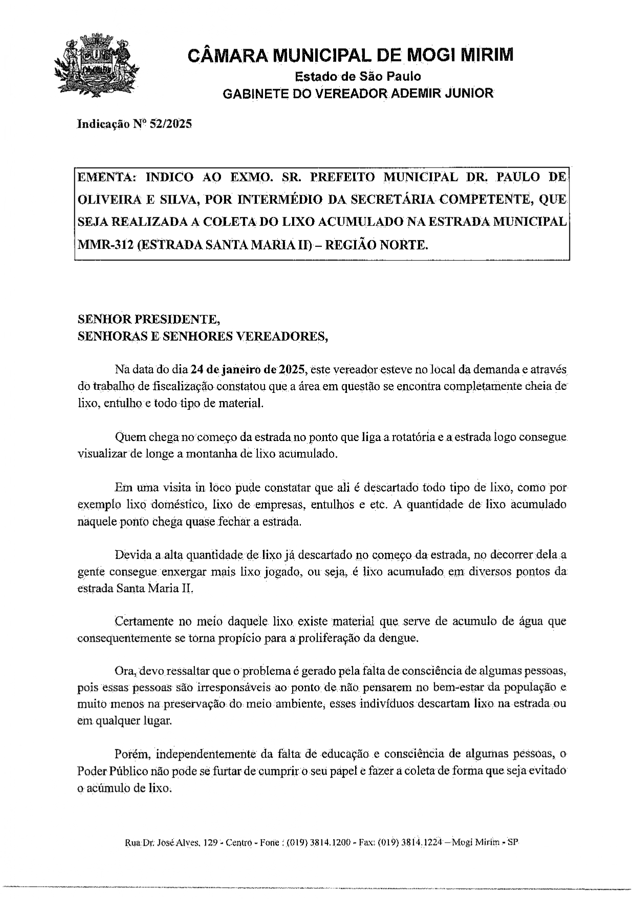 Assunto: REITERO A INDICAÇÃO Nº 52/2025 SOLICITANDO A REALIZAÇÃO DA COLETA DE LIXO ACUMULADO NA ESTRADA MUNICIPAL MMR 312 (ESTRADA SANTA MARIA II) – REGIÃO NORTE.